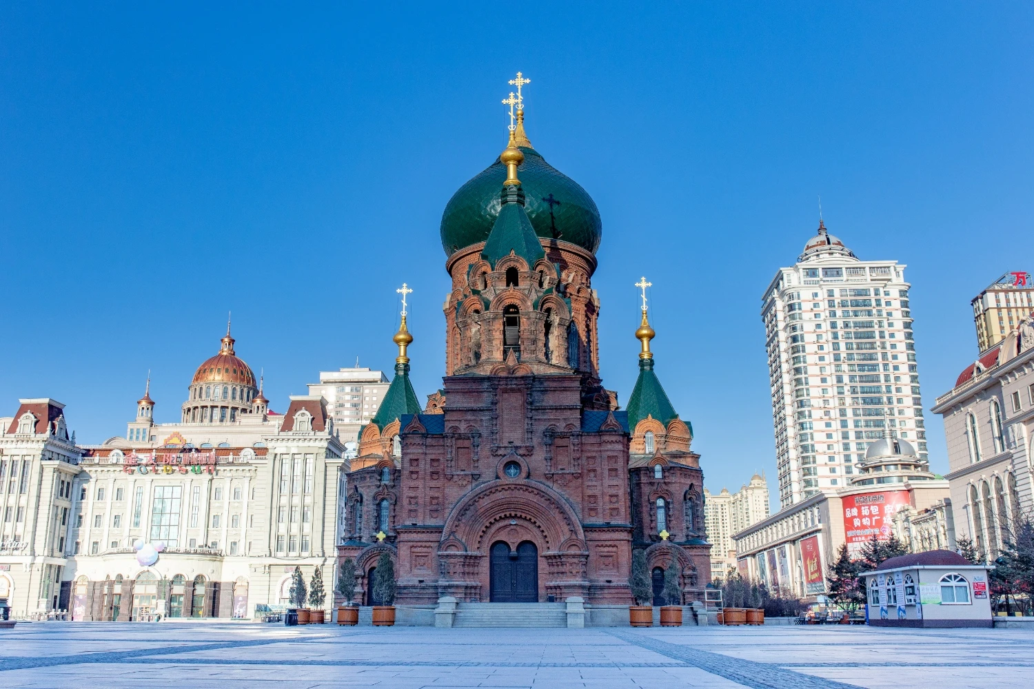 索菲亞教堂墨綠穹頂擎起東方聖彼得堡舊夢,紅磚牆體承載百年風雪。壁畫殘影與鴿群共舞,鐘生沉寂成城市符號,在現代化樓宇間定格成哈爾濱最滄桑的異域印記。