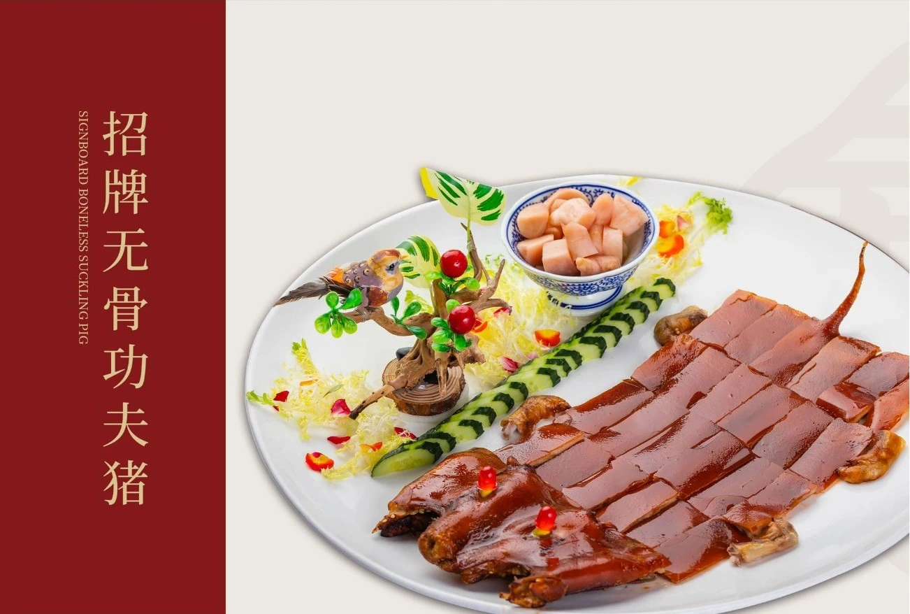 珍之寶悅喜酒樓的招牌菜“無骨功夫豬”改良自順德燒豬,以獨特的“功夫”製作工藝,成為餐廳的鎮店之寶。這道菜的豬肉嫩滑無骨,口感鮮美,深受食客喜愛。