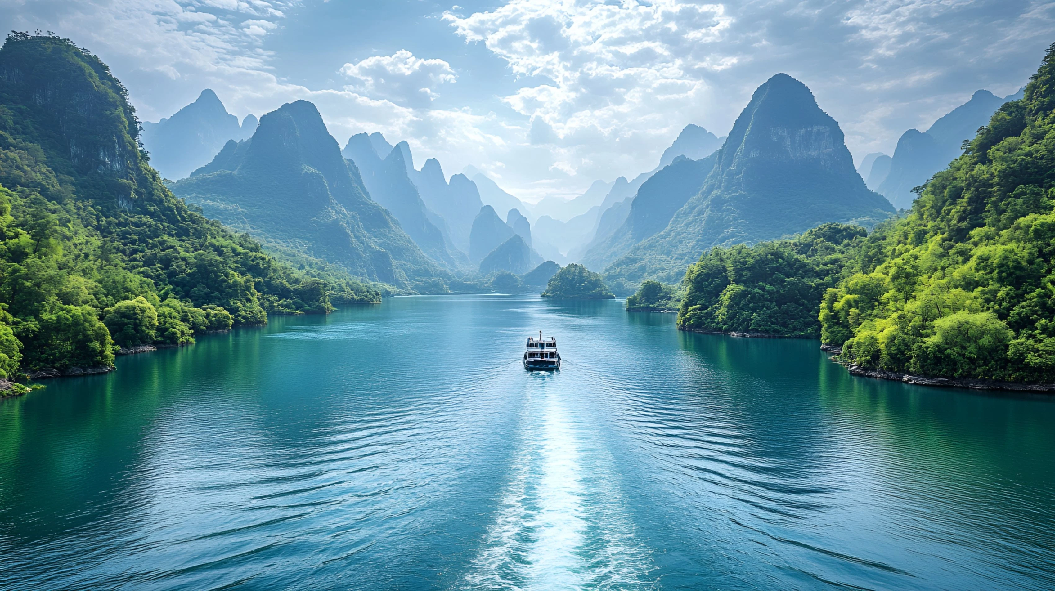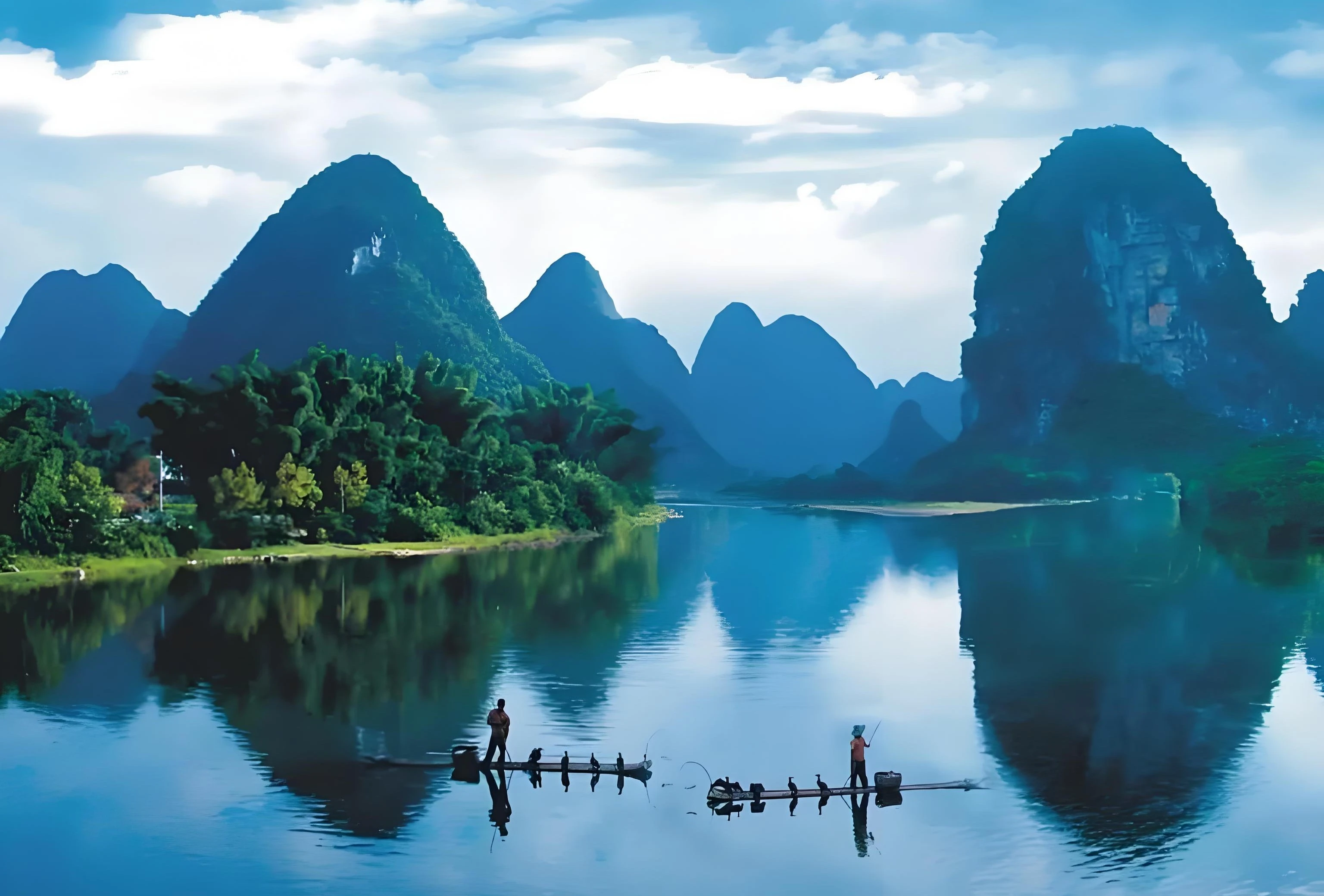 兩岸喀斯特峰林拔地而起,如筍如簪,倒映碧水形成「青山浮水」的奇幻鏡像,船行江中宛若穿行立體畫廊。