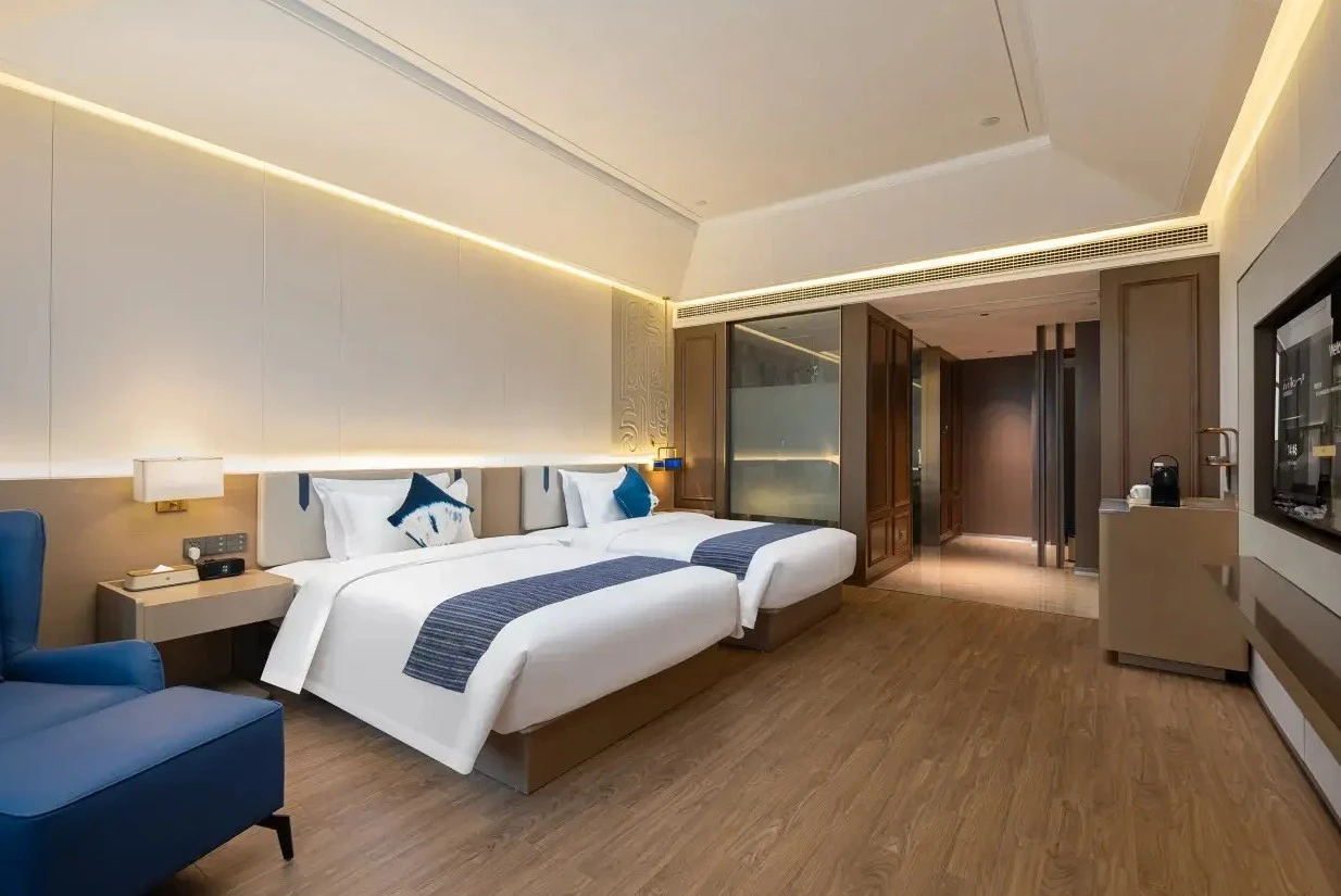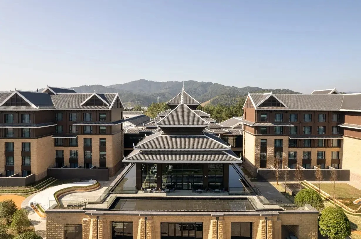 米藍國際酒店是由北京七十二創設計的貴州高端非遺藍染文化酒店,不僅提供奢華的住宿與完善的設施,更致力於成為貴州非遺文化的活態展示視窗。酒店本身就是一件融合傳統與現代的藝術品,大堂穹頂設計靈感源自侗族鼓樓,六邊形蜂巢結構嵌以彩燈,光影流轉間訴說著苗山侗水的千年傳奇。