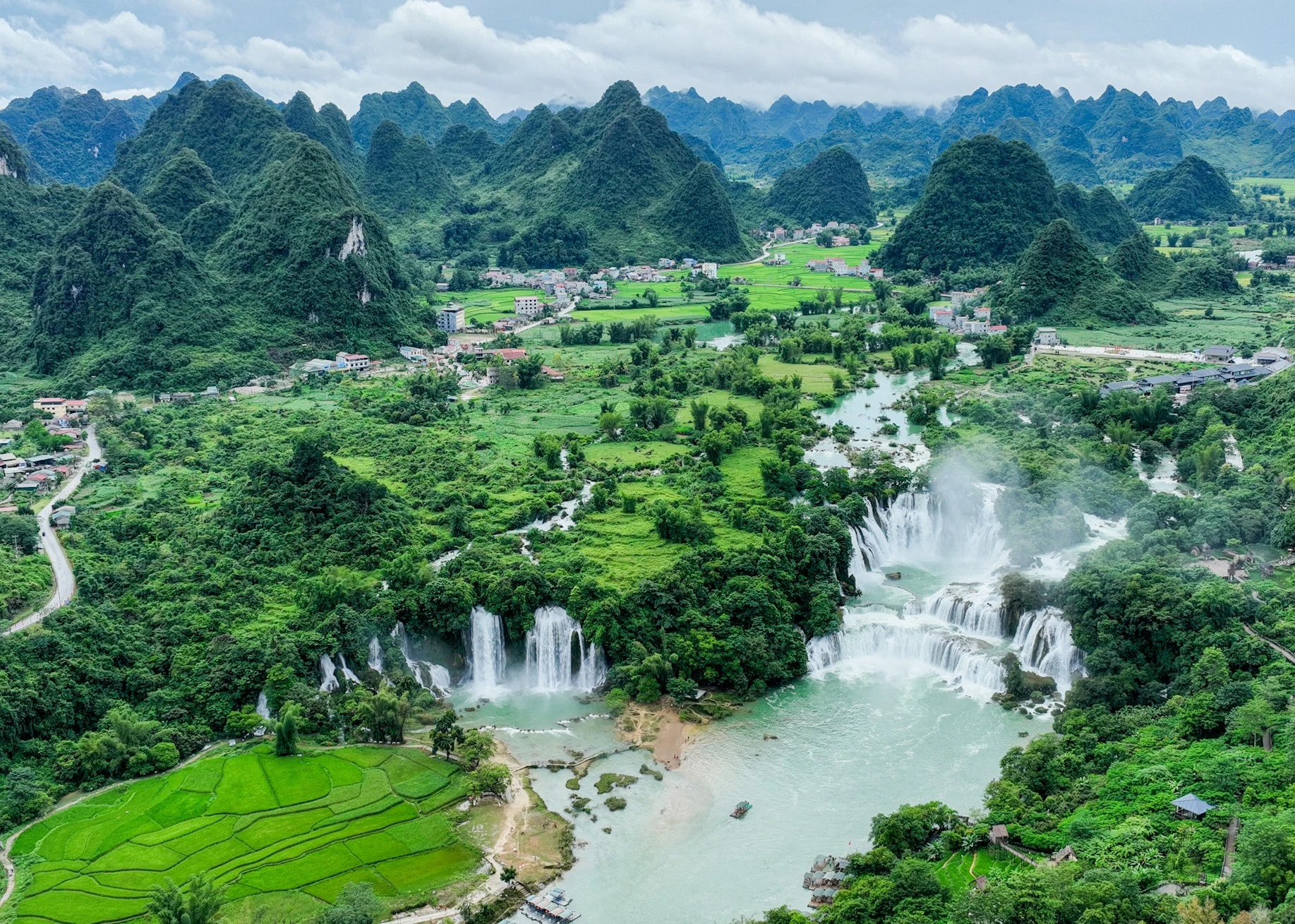連綿的喀斯特山峰拔地而起,如田螺伏地、春筍破土、將軍屹立,在雲霧中若隱若現,倒映於明仕河的碧波中,形成「舟行碧波上,人在畫中游」的夢幻場景。明仕河水發源于越南,清澈如翡翠絲帶蜿蜒,水草柔曼搖曳,魚群穿梭其間。乘竹筏順流而下,兩岸鳳尾竹沙沙作響,白鷺掠水而過,仿佛滑入流動的水墨畫。