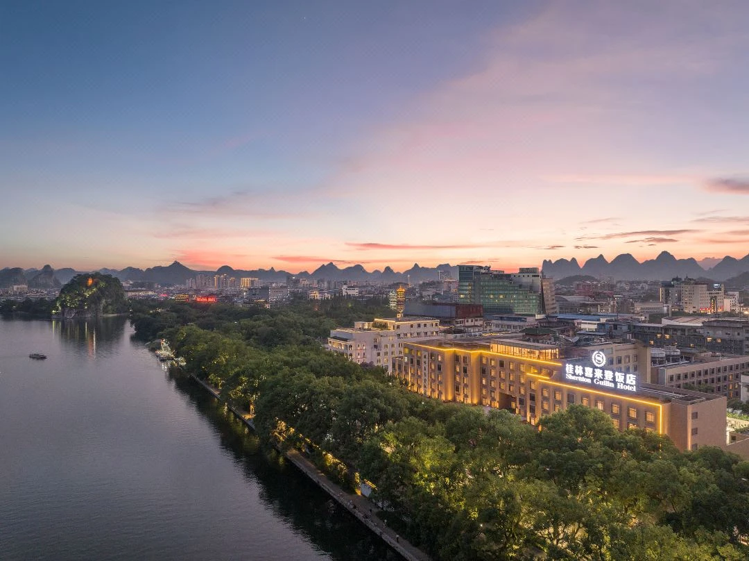 廣西首家五星級國際品牌飯店,2021年完成全面裝修升級。主體採用庭院式中空挑高設計,米棕色外觀搭配羅馬式金碧大堂,旋轉樓梯與復古電梯保留歷史特色。客房融入淡雅桂林山水元素,配備復古衛浴,營造輕奢氛圍。飯店前面是美麗的漓江,後面是桂林最熱鬧的正陽步行街,地理位置極佳。