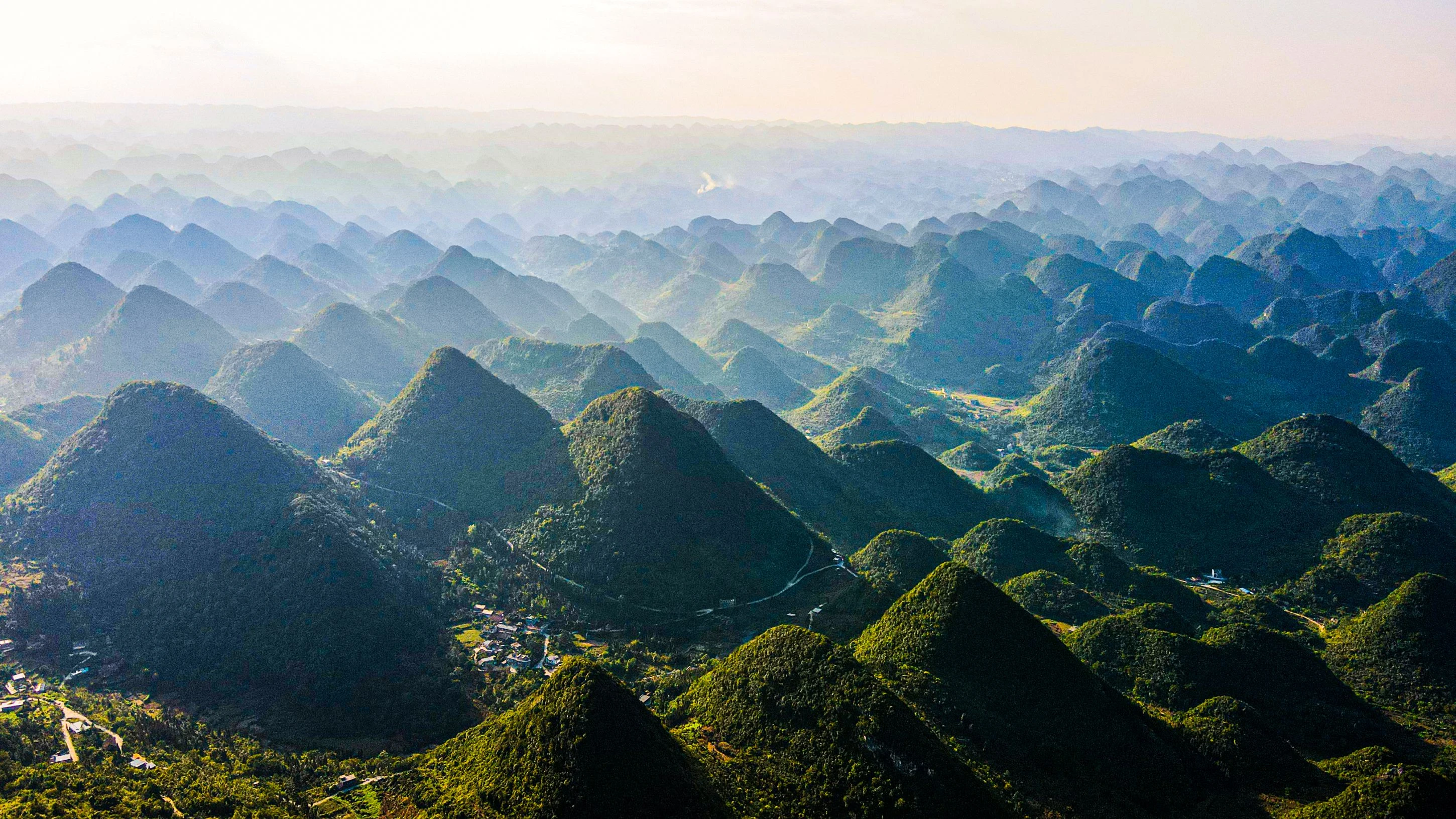萬峰林由成千上萬座奇峰組成,峰群綿延起伏,宛如浩渺的海洋中凝固的波浪。從高空俯瞰,山巒層疊,有的如利劍直插雲霄,有的似巨獸匍匐大地,形成一幅震撼的自然畫卷。