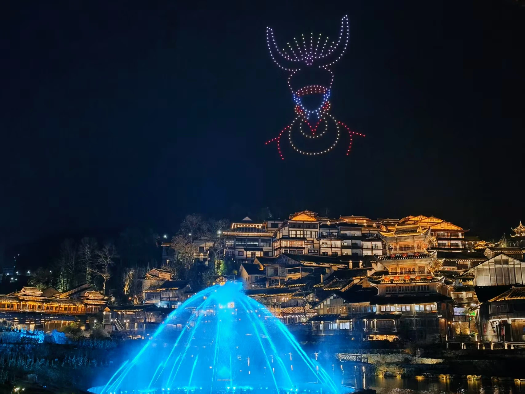千架無人機在夜空變幻圖案(照片夜空中的-苗女,即為無人機所排列),與音樂噴泉組成「水火交響曲」,夜空中流光如金蝶振翅。千家燈火沿山勢層疊點亮,吊腳樓群倒映烏江水面,宛如星河墜入人間,江面碎光隨搖櫓船蕩開粼粼詩行。