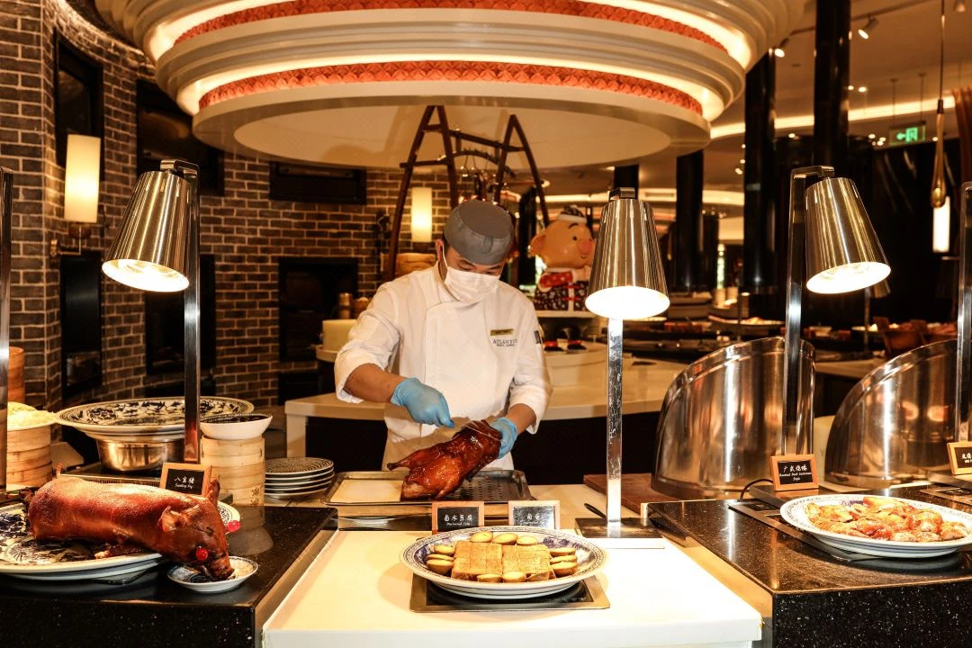 中式為主,含北京烤鴨、烤乳豬、廣式燒臘、川菜及小火鍋,海鮮區提供青口貝、大蝦等。
