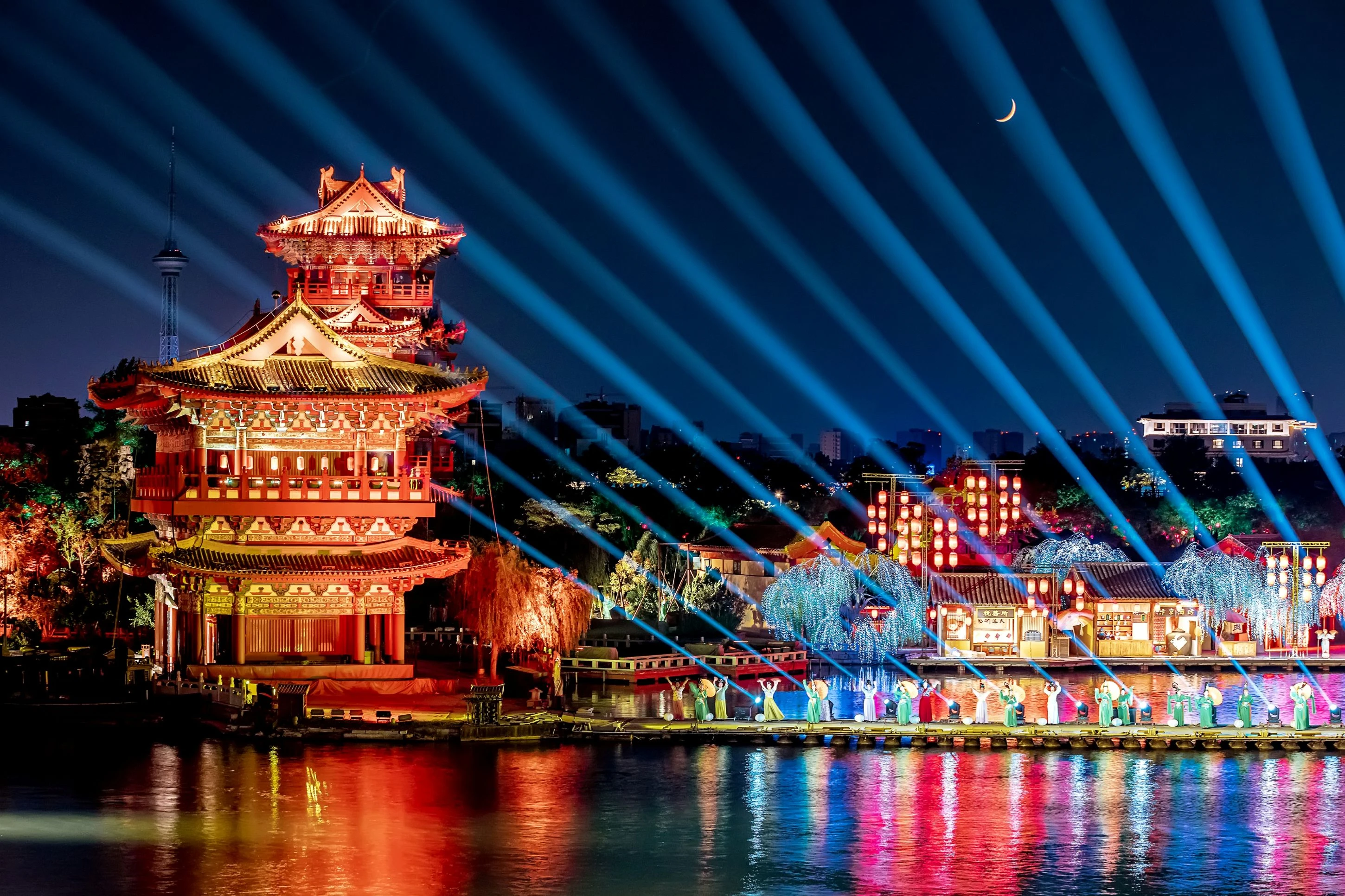 拂雲閣:園內最高建築31.99米,登閣可俯瞰全園宋式建築群,晴日碧瓦映天光,夜晚燈火勾勒飛簷輪廓,與龍亭湖夜景交相輝映。
