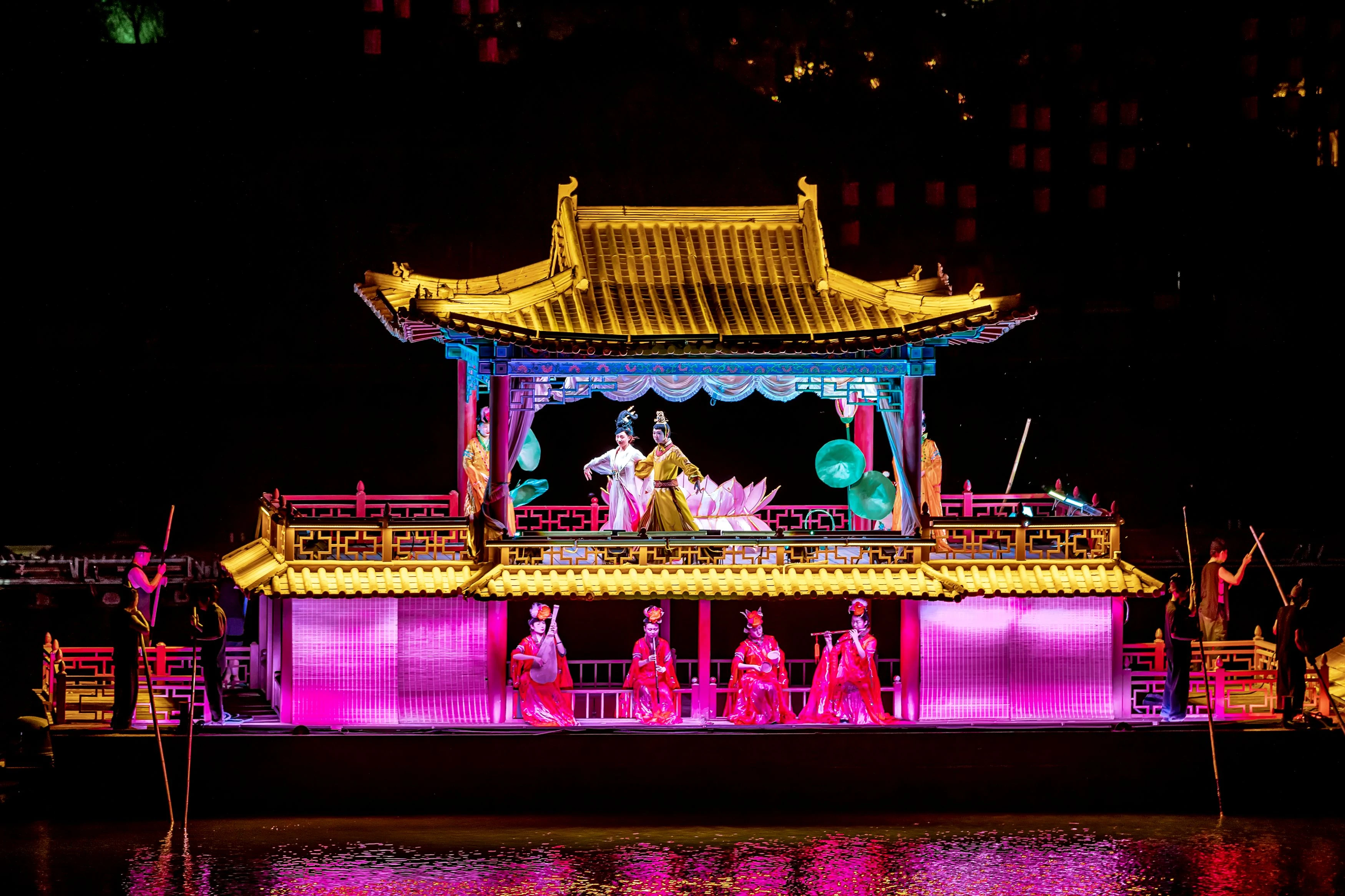 以清明上河園景龍湖為核心,亭台樓榭與湖面構成天然劇場,700多名演員在水陸空三維空間演繹北宋興衰史。