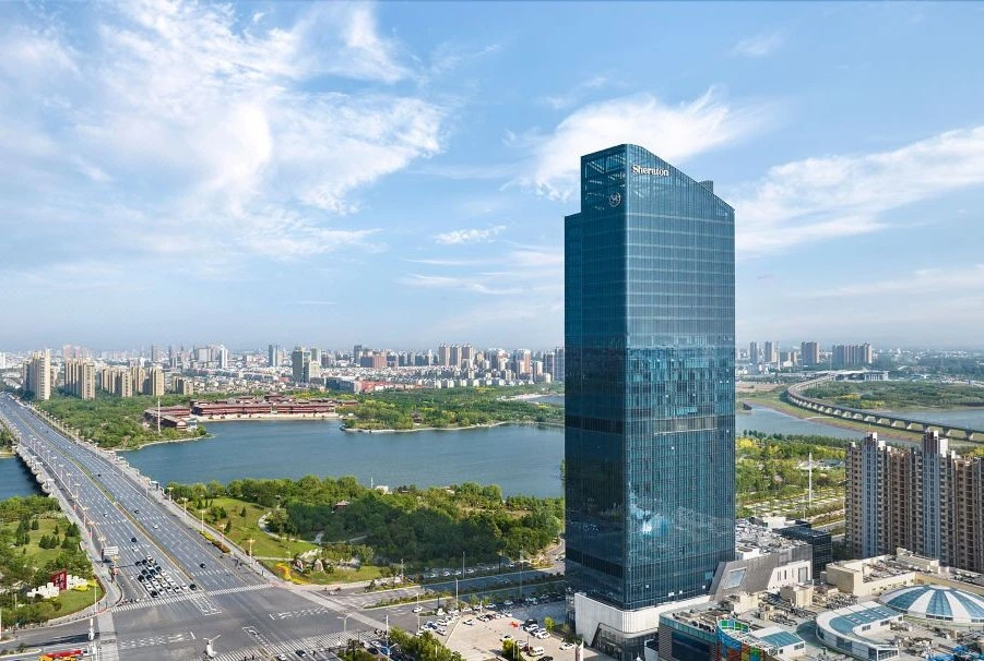 融合唐宋皇家園林藝術與現代美學,大堂牆面以龍門石窟為靈感,採用自然石材拼合。客房全景落地窗設計,部分房型享開元湖或城市景觀,高層客房視野開闊。