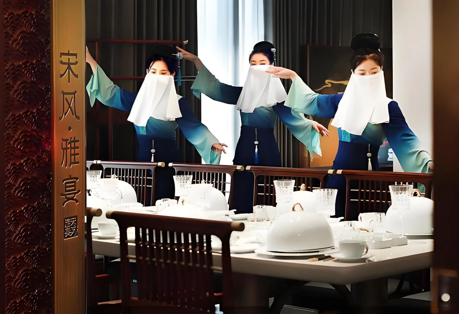 選址雙龍巷歷史街區,店內裝修融合宋式美學元素(瑞鶴圖裝飾、仿古傢俱),服務人員戴面紗迎賓、著古裝服務,營造沉浸式穿越體驗。