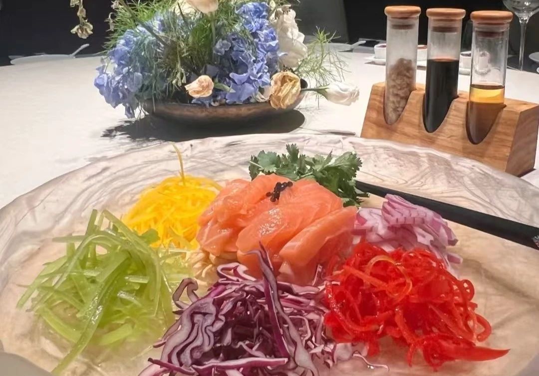 粵菜「撈起三文魚」借鑒南洋「魚生」習俗,以「越撈越高,風生水起」為吉祥寓意。其吃法需將三文魚與七種配菜、蘸料拌勻,動作本身兼具互動性與趣味性,與傳統詩詞中「揮杆」「撒網」的動態描寫形成跨時空呼應。