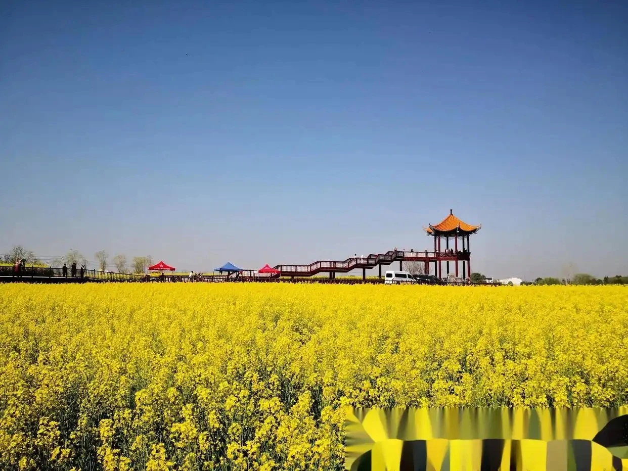 荊門油菜花田如一塊巨大的金色絨毯,從山腳鋪向天際,陽光下閃爍著蜂蜜般的光澤。微風拂過,花浪層層疊疊,仿佛大地在呼吸,每一朵小花都像被陽光吻過的金箔,在風中輕輕搖曳。