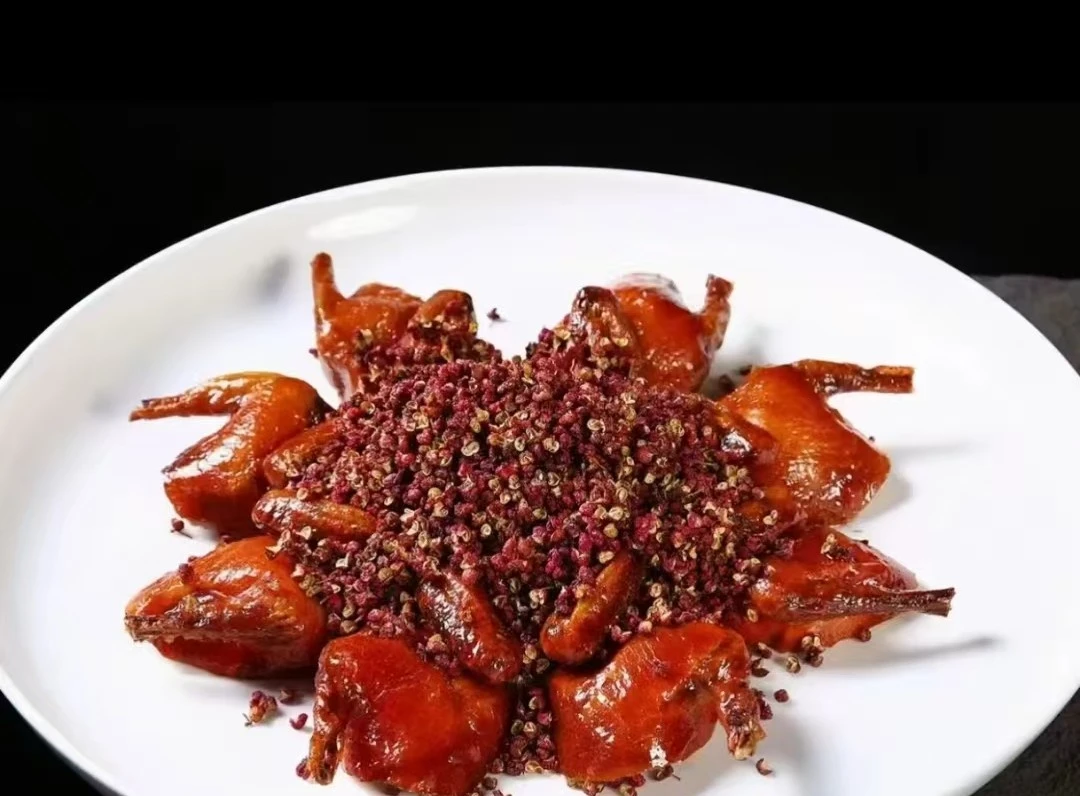「紅袍脆皮爆汁乳鴿」嚴選250克嫩鴿,以川式香料醃製入味。經獨特二次掛漿風乾工藝,成就薄如蟬翼的酥脆外皮。精準油溫鎖住肉汁,撕開瞬間汁水噴湧,佐以花椒提香,口感麻辣鮮香,層次分明。