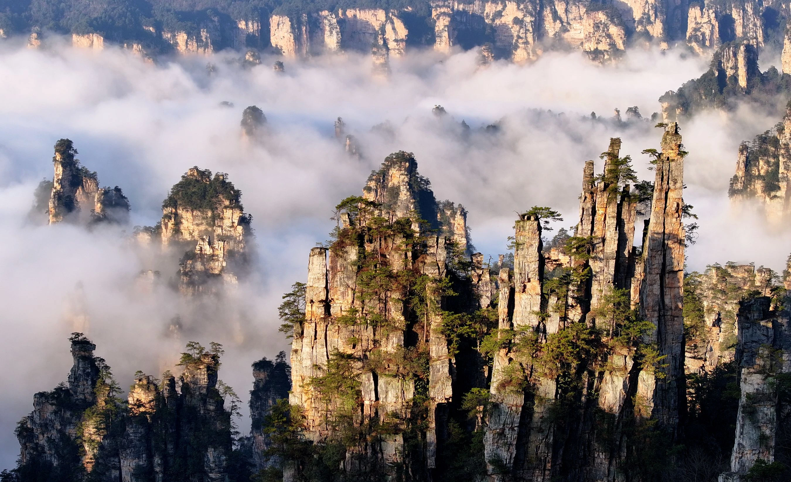 天子山特別安排乘坐索道上山,飽覽壯闊的西海奇景,千座山峰直刺雲霄,峰巒層疊,雲霧繚繞,宛如仙境。百龍電梯則是世界最快、最高且完全暴露於戶外的觀光電梯,直抵山巔,節省體力。