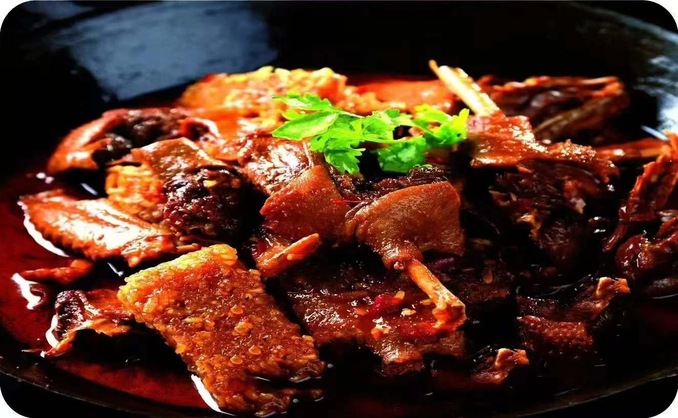 血粑鴨是鳳凰古城極具代表性的傳統風味菜。選用當地土鴨搭配特製的糯米血粑,經慢火炖煮,肉質鮮嫩、湯汁濃郁,糯米血粑吸飽鴨湯精華,口感柔韌香糯,風味獨特。