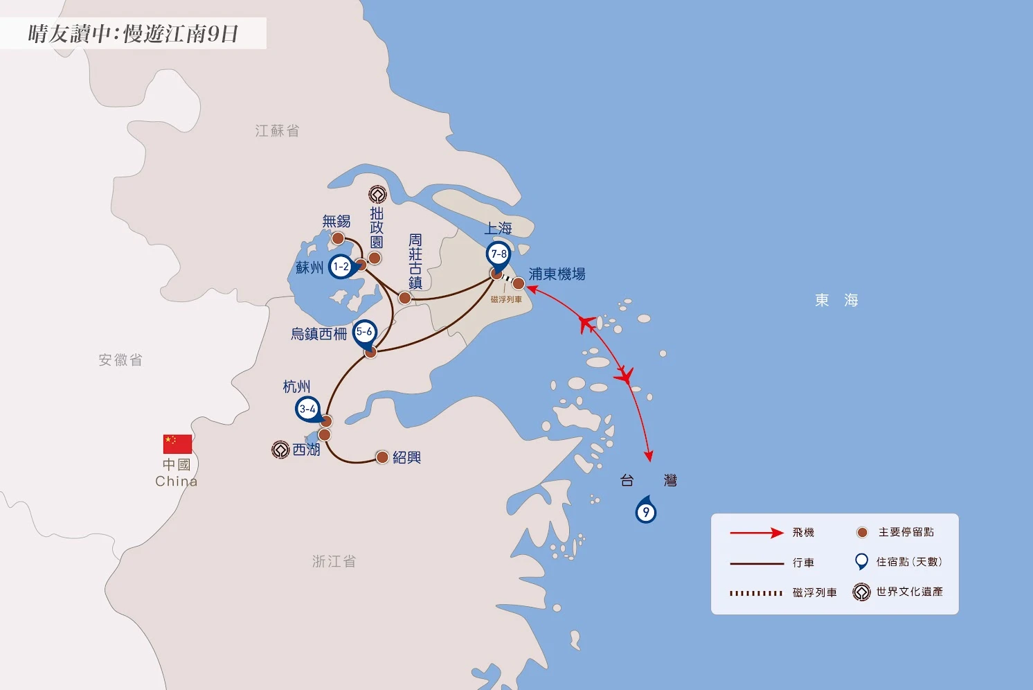 桃園國際機場✈上海浦東機場-搭乘磁浮列車-上海-85km-周莊【周莊古鎮】-30km-蘇州