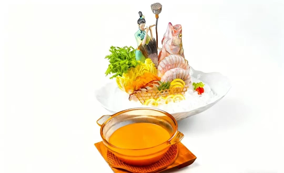 『紫銅鍋古法火焰雞』上桌時點燃火焰,儀式感十足,源自舊時香港富豪家宴,雞肉鮮嫩多汁,搭配特製調料,鹹香濃郁,是餐廳最具代表性的菜品之一。