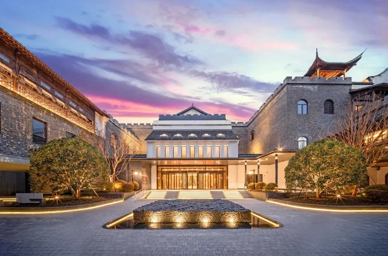 酒店融合六朝古都文化與現代奢華的藝術空間。酒店以中國院牆合圍的皇城風格設計,23層主樓坐擁長江景觀,玻璃光廊和手工梅花樹大堂是標誌性亮點。