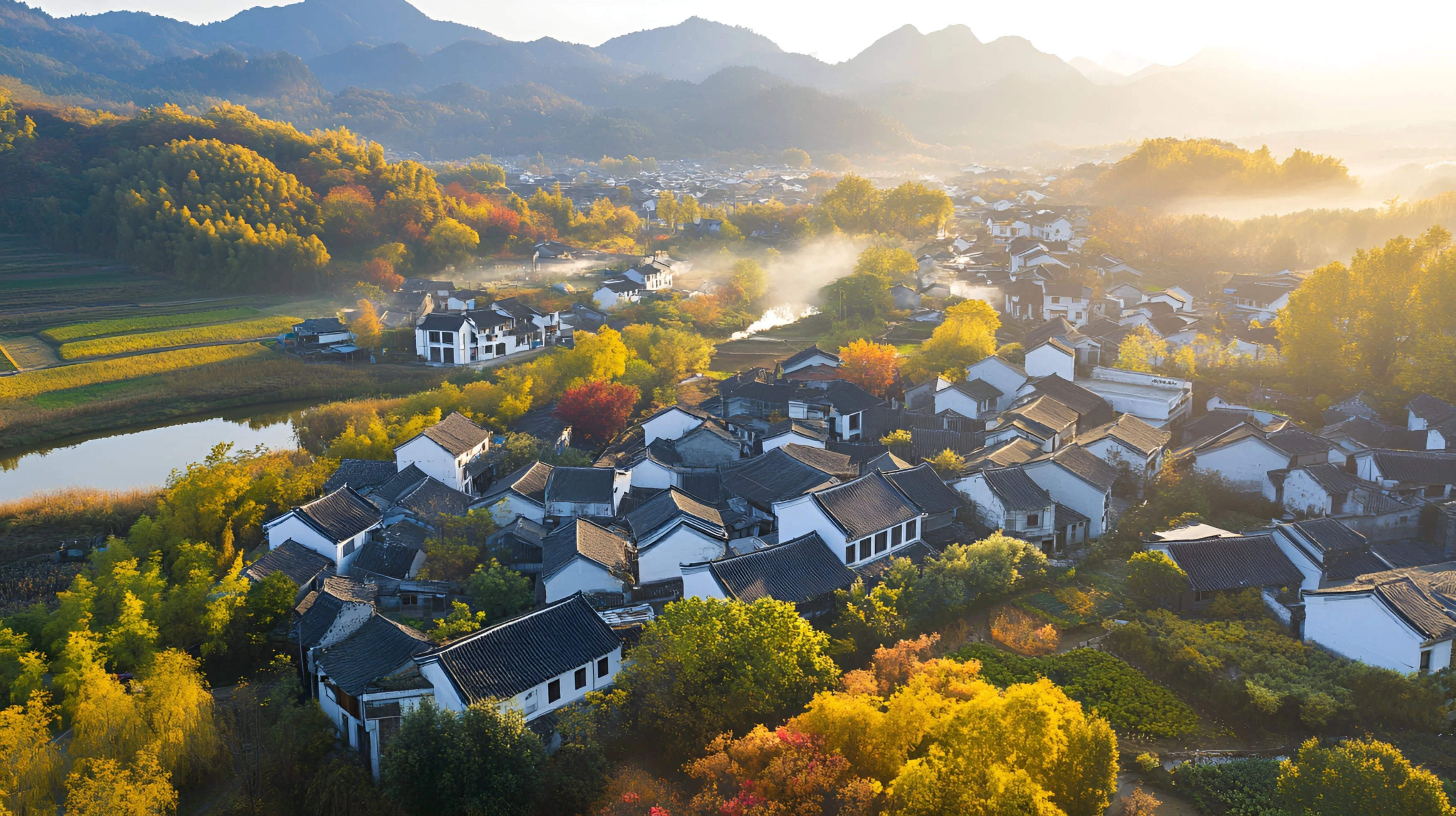 古村落被楓林環繞,村民在石板路上勞作,曬秋竹匾與飄落的楓葉共構生活畫卷。戴村古驛道上,老人與孩童踩過紅葉的身影,定格成溫馨的時光印記。