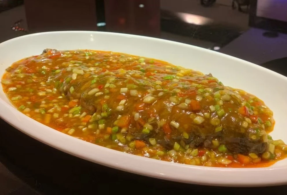 蔥燒武昌魚魚肉鮮嫩無腥味,醬汁濃郁,蔥香四溢。