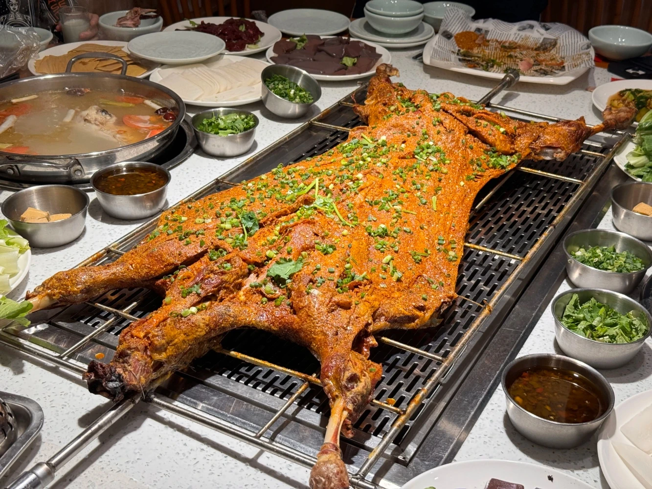 呼倫貝爾烤全羊選用草原散養羔羊,以傳統爐火慢烤,外皮酥脆金黃,內裡鮮嫩多汁,是承載著蒙古族待客之禮的隆重風味。