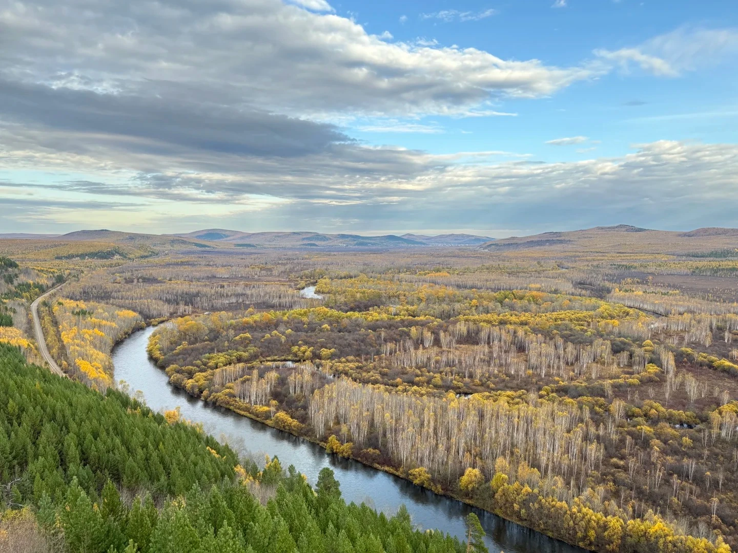 九曲十八彎濕地公園地處大興安嶺北麓,是額爾古納河在原始森林與草原交界處自然沖刷而成的彎曲河道景觀。登高俯瞰,河水如湛藍綢帶般千回百轉,穿梭於金黃草甸、墨綠林海與斑斕濕地之間,四季光影流轉,晨昏雲霧繚繞,宛若大自然揮灑出的巨幅抽象畫卷,靜謐而壯麗。