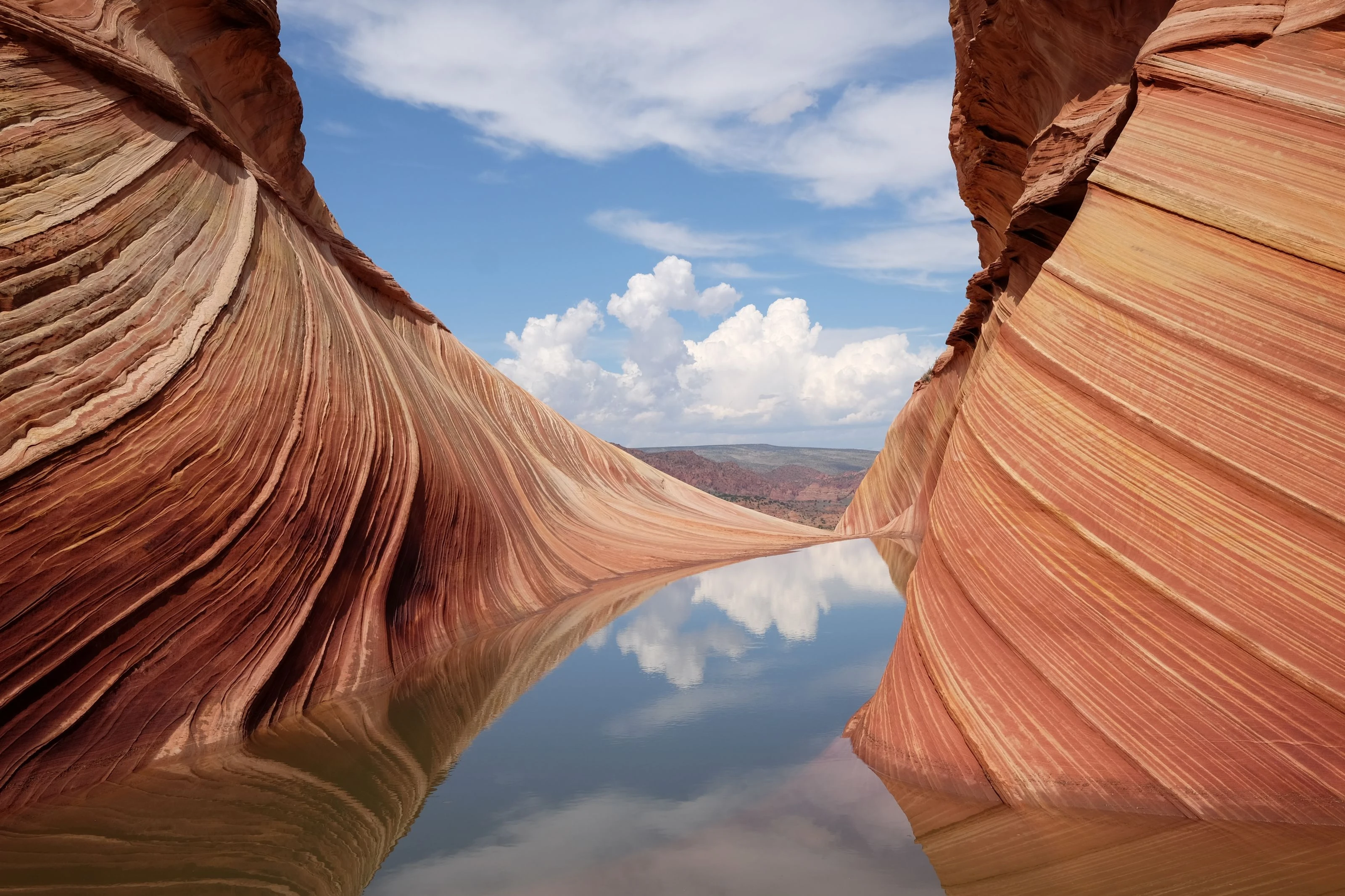 如一匹被天神遺落的綢緞,鋪展在荒原之上。每一道波紋都是億萬年的詩行,層疊的岩層如凝固的火焰,從深紅到橙黃,再到淺金的漸變,仿佛落日熔金時天空的倒影被大地悄然收藏。