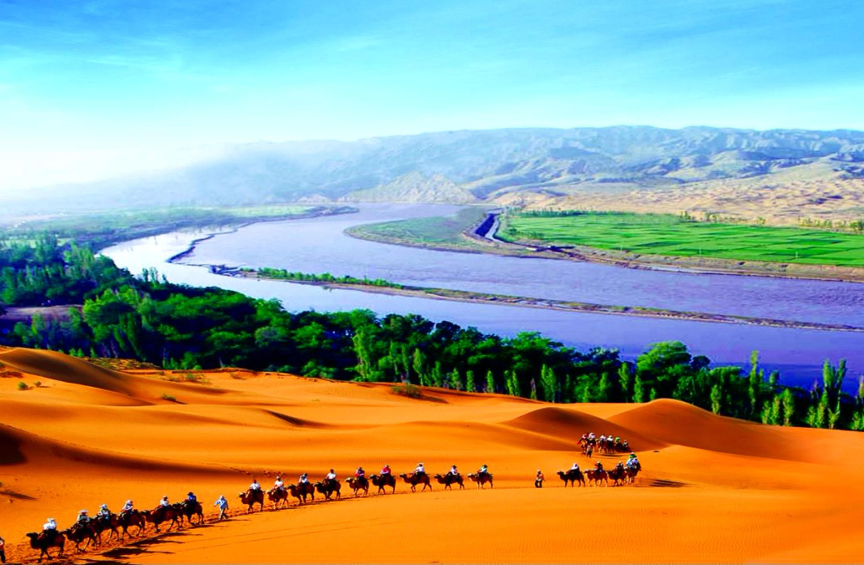 沙坡頭地處寧夏與內蒙古交界,以「沙河相依」的壯麗景觀聞名。金色的騰格裡沙漠在此遇九曲黃河戛然而止,形成陡峭的百米沙山。景區內既可乘羊皮筏漂流黃河,也可騎駱駝深入沙漠、體驗滑沙飛馳,更可登上沙丘俯瞰「黃河第一彎」的遼闊氣象,是中國乃至世界罕見的生態旅遊奇觀。