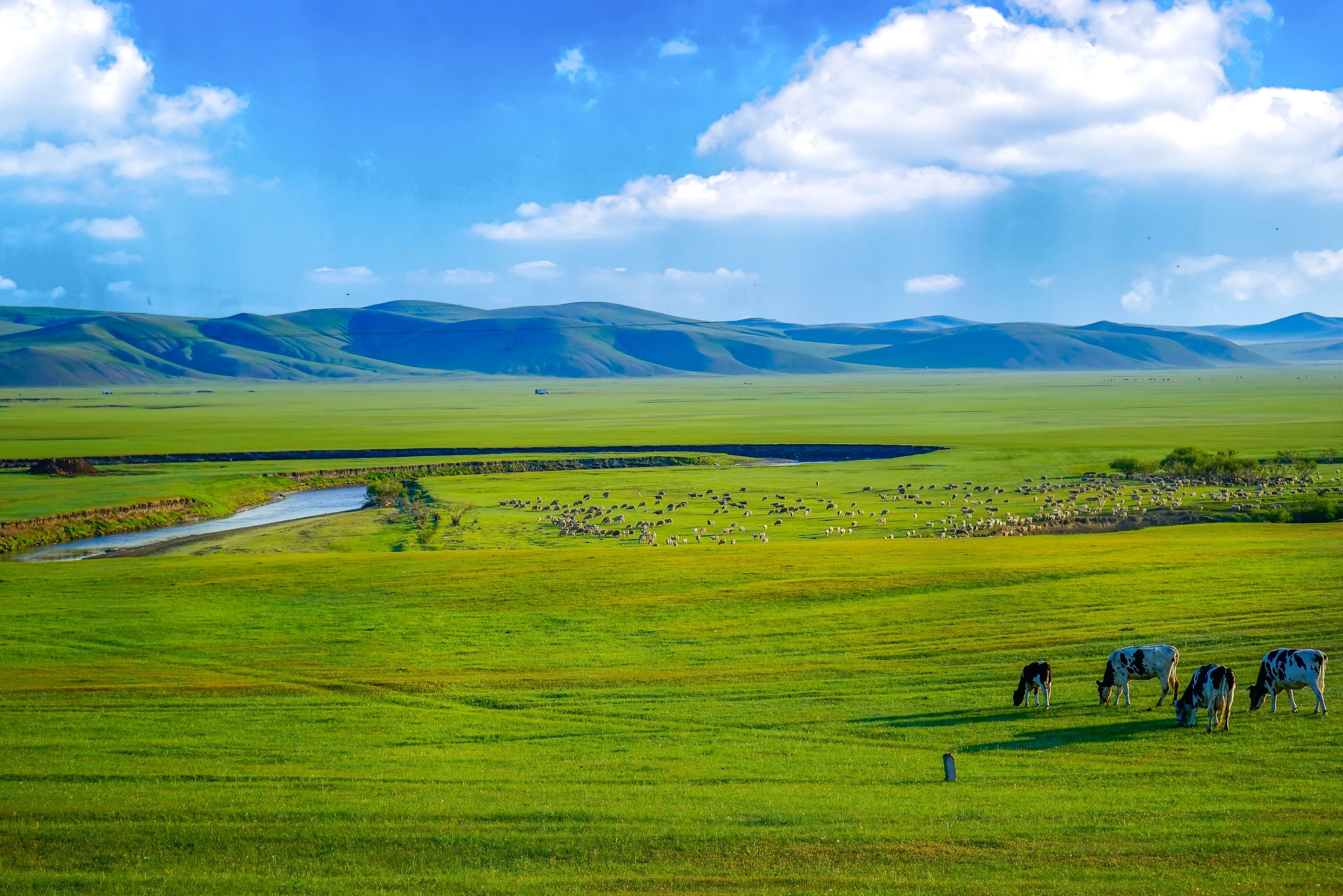 雲影輕掠、牧歌悠悠。牛羊自在漫遊於無邊綠毯,野花點綴其間,微風拂過,掀起陣陣溫柔的綠色波浪。置身其中,心緒隨著雲卷雲舒,沉醉於自然的詩意與寧靜。