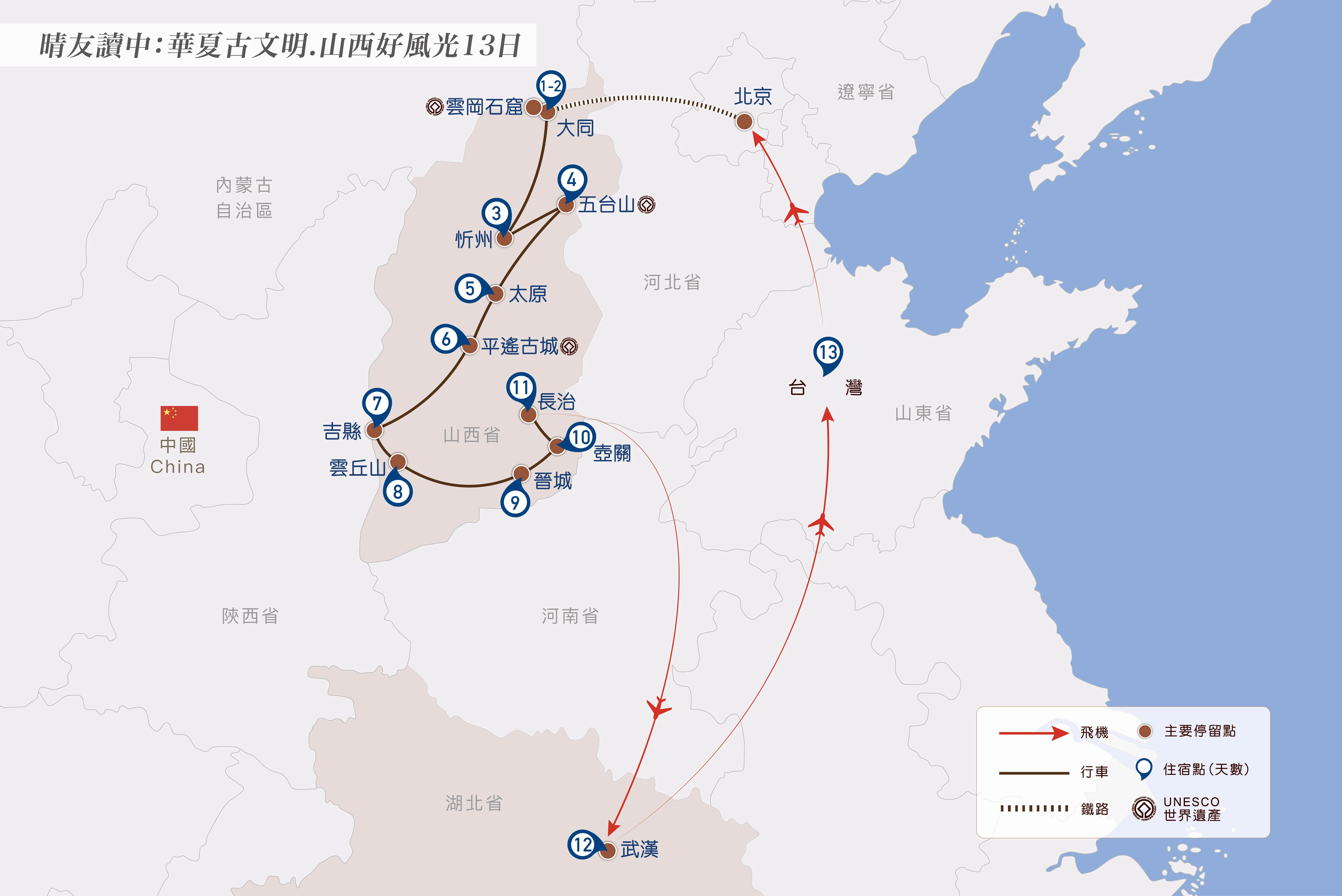 大同-75km-【懸空寺】-158km-【雁門關 (含★電瓶車)】-92km-忻州