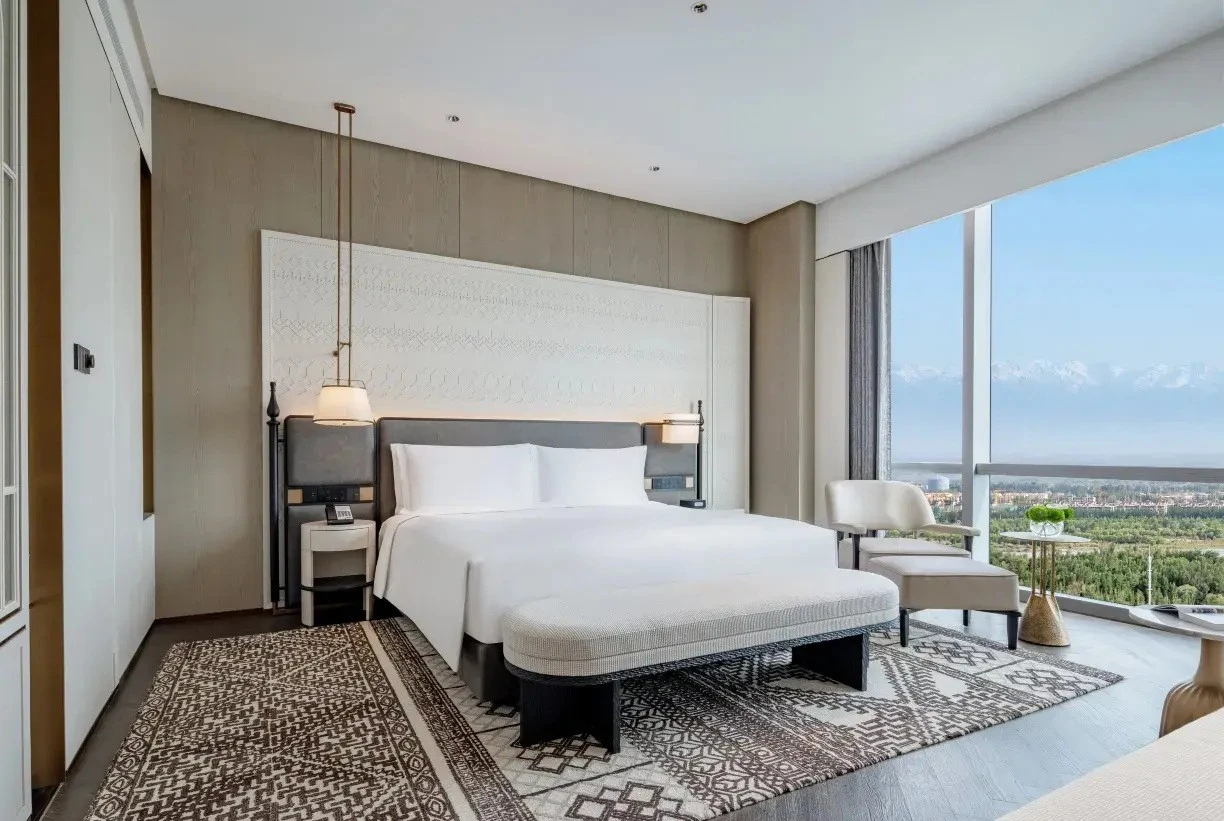 以「絲路秘境」為主題,建築外觀採用素淨牆體與葡萄架鏤空穹頂,大堂通過光影技術呈現遊牧民族氈房穹頂結構,並即時投射伊寧星空影像。