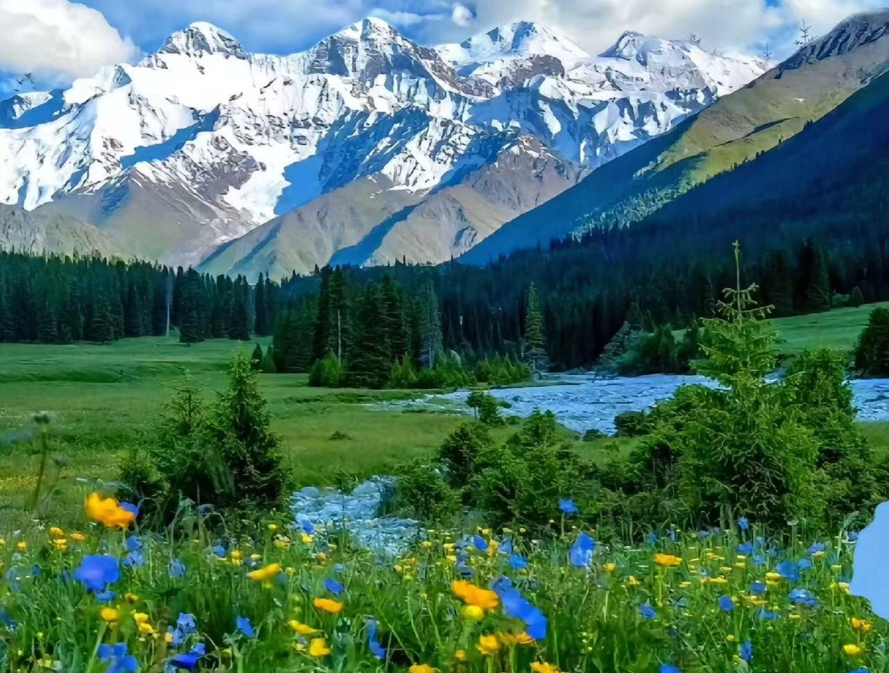 當風吹皺天山皺褶,伊黎河谷便抖開一卷碧色綢緞。野蘋果花簌簌搖落星塵,薰衣草將紫霧潑向蜿蜒的鞏乃斯河。雲影在草甸織就流動刺繡,牛羊踩著雲杉琴鍵漫步,金蓮花捧著落日熔化的金汁,將暮色澆鑄成蜜。