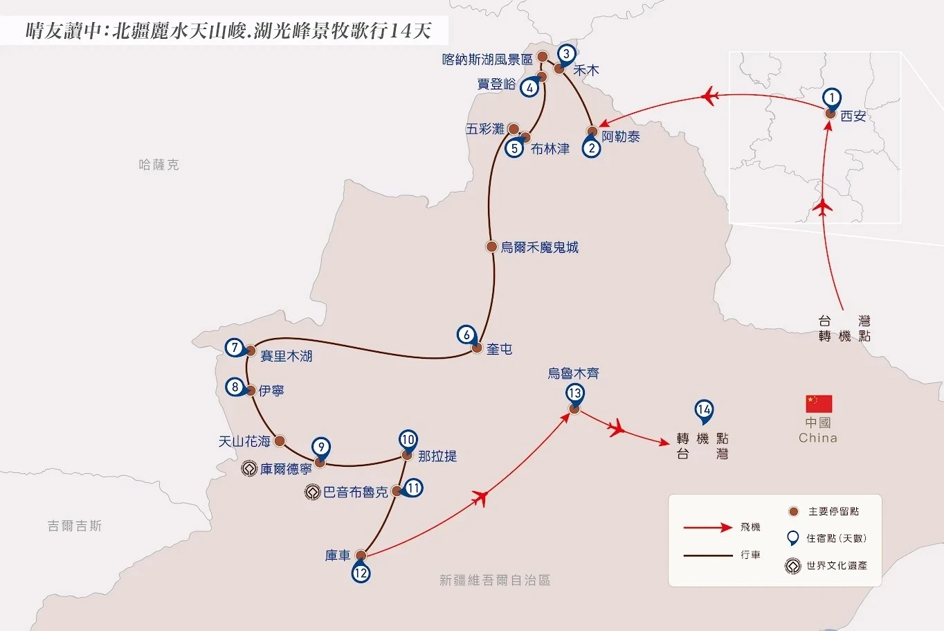 註:阿禾屬於山區道路,如遇惡劣天氣,規定只讓四驅越野車(無價差)進入,則7座商務車改乘四驅越野車。如果完全封路,改用巴士(退NT1900元)繞行布爾津前往禾木村