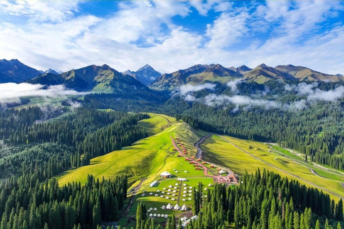 當風吹皺天山皺褶,伊黎河谷便抖開一卷碧色綢緞。野蘋果花簌簌搖落星塵,薰衣草將紫霧潑向蜿蜒的鞏乃斯河。雲影在草甸織就流動刺繡,牛羊踩著雲杉琴鍵漫步,金蓮花捧著落日熔化的金汁,將暮色澆鑄成蜜。