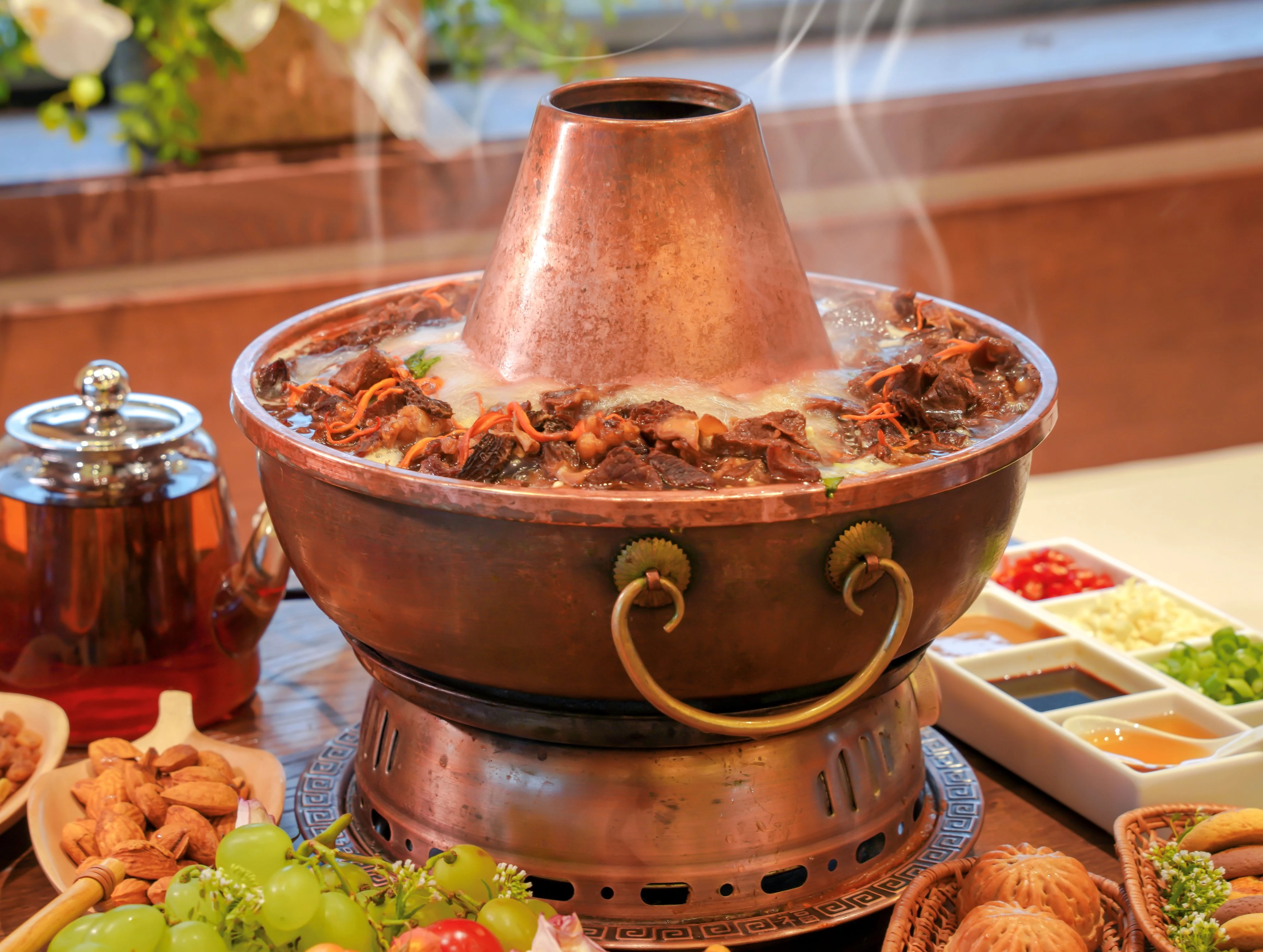 銅鍋木炭:採用傳統銅質火鍋,鍋身雕刻花紋兼具藝術性,木炭為燃料保證受熱均勻,保留食材原味。自然調味:少用紅油及過多調料,突出食材本味,辣椒油或蒜蓉蘸料可依個人口味添加。