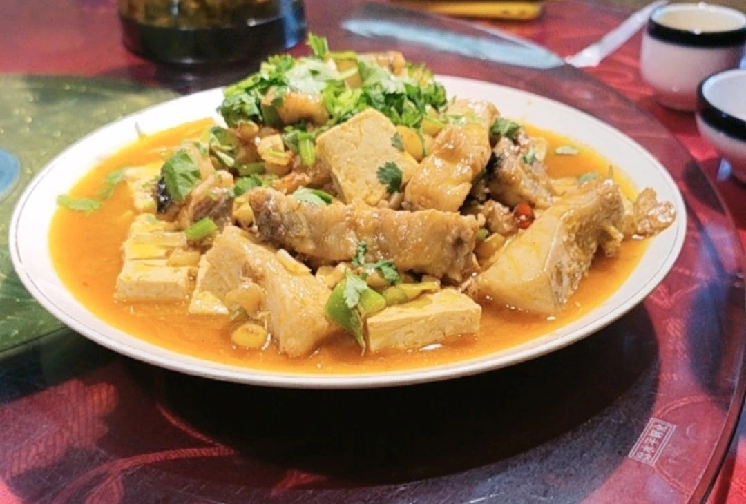招牌特色『狗魚燒豆腐』狗魚肉質緊實如蒜瓣,豆腐嫩滑入味,醬香濃郁湯汁醇厚,常搭配米飯或饢食用。