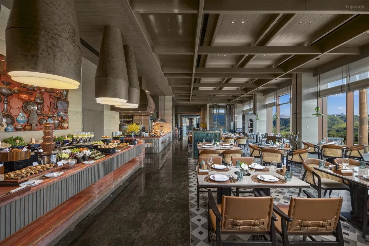 以哈薩克族待客禮儀為核心,落地玻璃窗設計將草原景觀融入用餐環境。菜單包含低溫慢煮熏馬腸、分餐制手抓肉等創新改良的本地菜品,搭配包爾薩克(油炸麵食)與奶茶的經典組合。