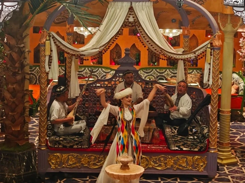 美食宮的裝修風格獨具匠心,仿佛置身於土耳其的豪華宮殿中,室內噴泉潺潺,新疆歌舞表演為用餐增添了濃厚的氛圍。