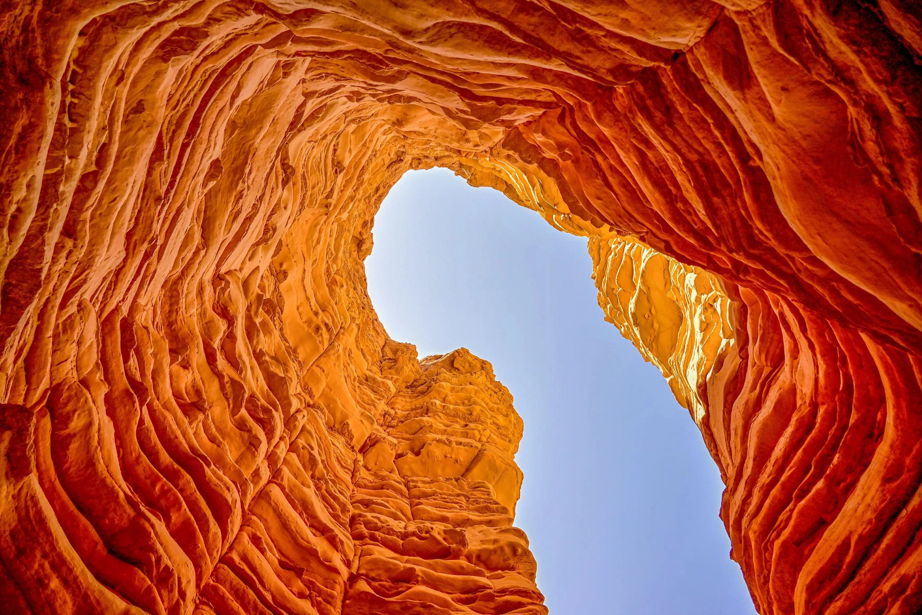 風蝕岩壁如時光的刻刀,將億萬年的故事雕琢成通天洞的蒼穹之眼。紅黃灰三色岩層交錯,壯年期的雅丹城堡群是大地寫給天空的狂草詩。
