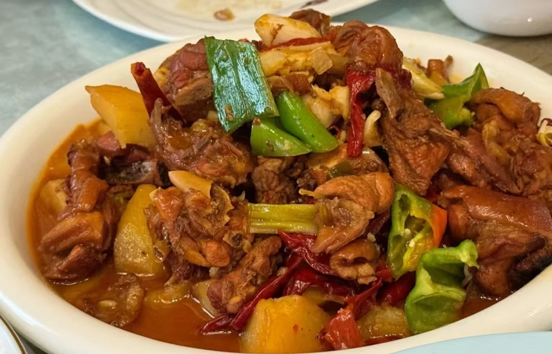 以新疆特色民餐為核心,融合異域風情裝修與歌舞表演,成為烏魯木齊乃至新疆餐飲文化的代表之一。『新疆大盤雞』以地道風味和獨特呈現方式成為招牌菜品。雞肉與土豆1:1搭配,湯汁收至原量1/3,青紅椒點綴增色。選用散養土雞,肉質緊實;土豆燉至邊緣透明,皮帶麵筋道吸汁,辣中帶香。