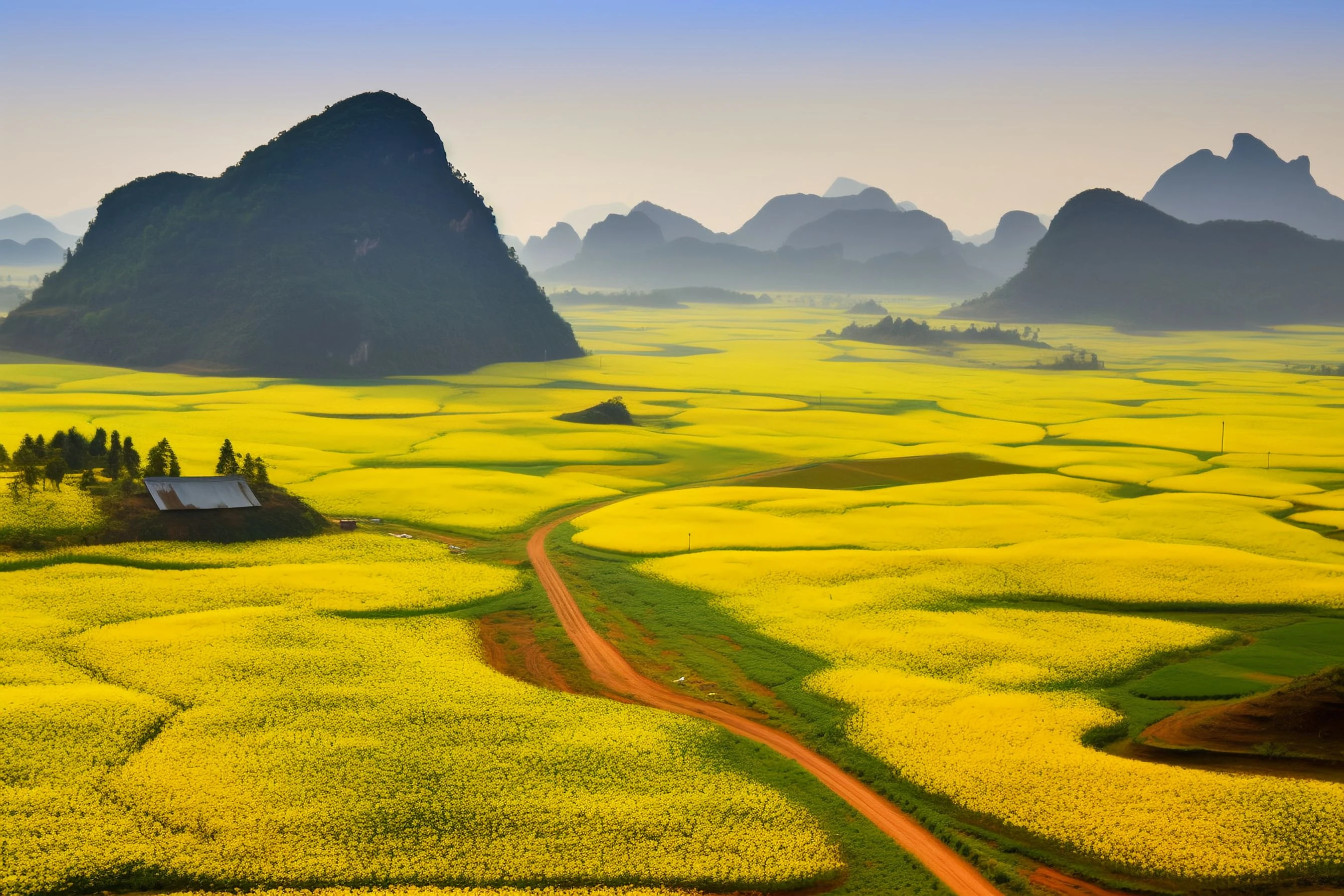 三十萬畝油菜花已在天際線鋪開流動的琥珀,喀斯特峰叢是墨色的五線譜,花浪是跳躍的音符,風掠過時整片高原都在演奏貝多芬的《田園》。布依族姑娘的彩裙在花海裡時隱時現,像蝴蝶偶然停駐在鎏金的詩行間。