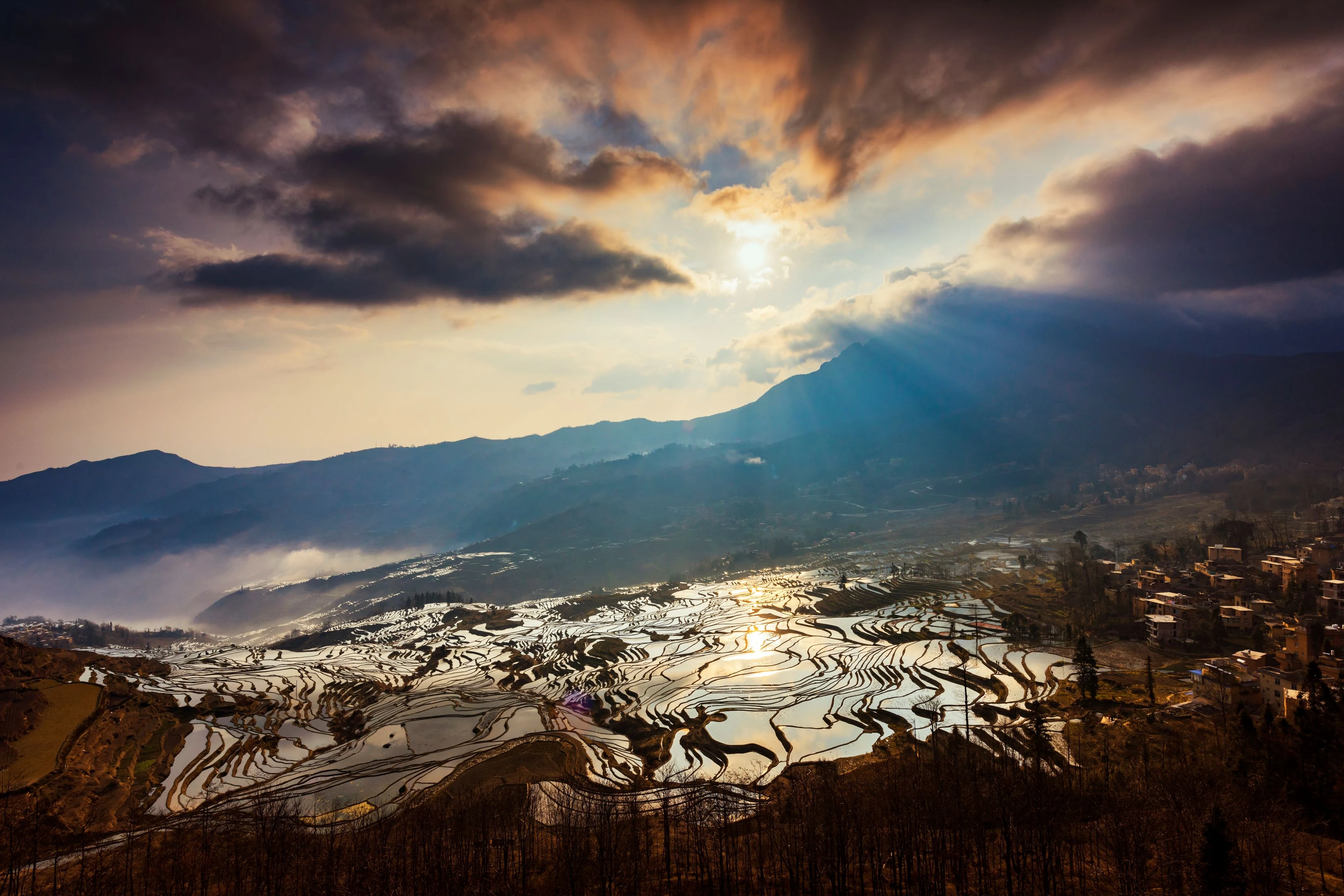 水牛犁過鏡面般的田,倒映著哈尼人的斗笠與雲影,天地在此交換妝容。蘑菇房炊煙嫋嫋,梯田的褶皺裡藏著「森林-村寨-梯田-水系」四素同構的千年智慧。雲霧從谷底升起,萬畝梯田如綠綢懸空,恍若神人遺落的鏡廊。日落時分,梯田從翡翠漸變為熔金,最後沉入靛藍的夜幕。