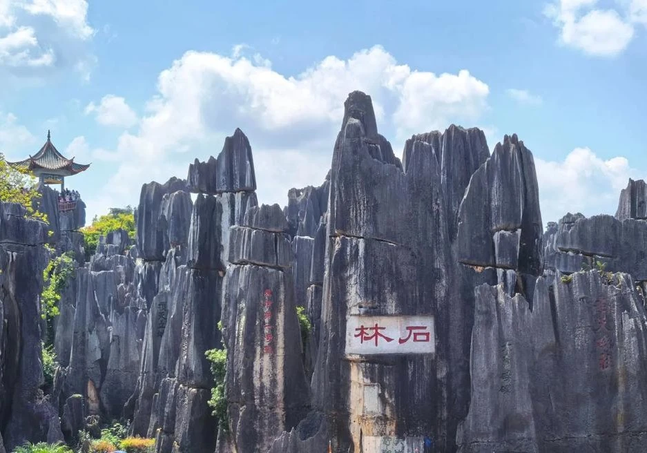 陽光為石峰鍍上金邊,遠望如千軍列陣,近觀似眾生百相,大象汲水、鳳凰梳羽,天地在此雕刻永恆。蓮花池畔,山茶花與石影共舞,沈從文曾歎:「頑石竟解開花語」。