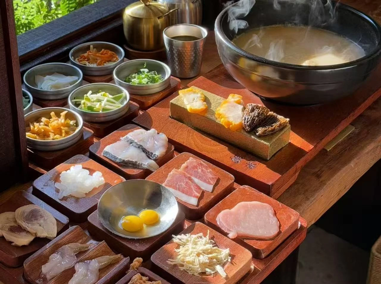 採用傳統六步吃法,湯底分酸湯/原湯兩種,搭配十餘種葷素配料,以雞湯為基底,加入濃湯寶提鮮,配菜需按生熟順序燙煮。